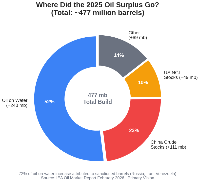 The IEA's own data shows that 72% of the increase in oil-on-water last year was attributable to sanctioned crude. These barrels are not truly 'surplus' in the traditional sense; they are stuck in logistical limbo, moving through dark fleet transfers and ship-to-ship operations that distort visibility into actual balances. Some analysts have argued that the glut forecasts are based on flawed assumptions, noting that EIA's own data show no major supply additions expected after late 2025. The reality is likely somewhere in between: supply growth is outpacing demand, but the 'untenable' 4 million barrel per day surplus some have projected may not materialize if sanctions continue to disrupt flows and China keeps absorbing excess barrels.