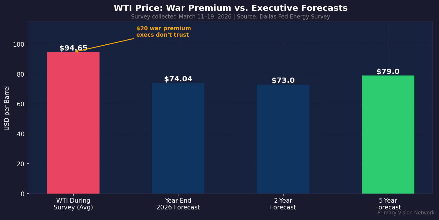 The macro backdrop driving all of this is impossible to ignore. WTI averaged $94.65 per barrel during the survey collection window of March 11-19, elevated by the Iran conflict and ongoing Strait of Hormuz disruptions. That price environment injected genuine energy into operator planning conversations. But what makes this moment interesting is the discipline accompanying it. Survey respondents expect WTI at $74 by year-end on average, meaning they are treating a meaningful portion of the current price as a geopolitical premium rather than a new structural floor.