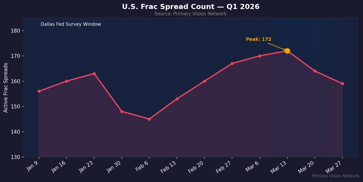 The Q1 2026 Dallas Fed Energy Survey arrived last week with a message that will surprise no one who has been following Primary Vision's completion data closely. The business activity index swung from -6.2 to +21.0, company outlooks flipped from -15.2 to +32.2, and oilfield services equipment utilization jumped from -12.2 to +30.2. For anyone tracking frac spreads and frac job counts through Q1, none of this is shocking. The recovery that Primary Vision's data has been signaling for weeks is now showing up in executive sentiment as well and that alignment between ground-level activity data and boardroom confidence is itself an important signal.