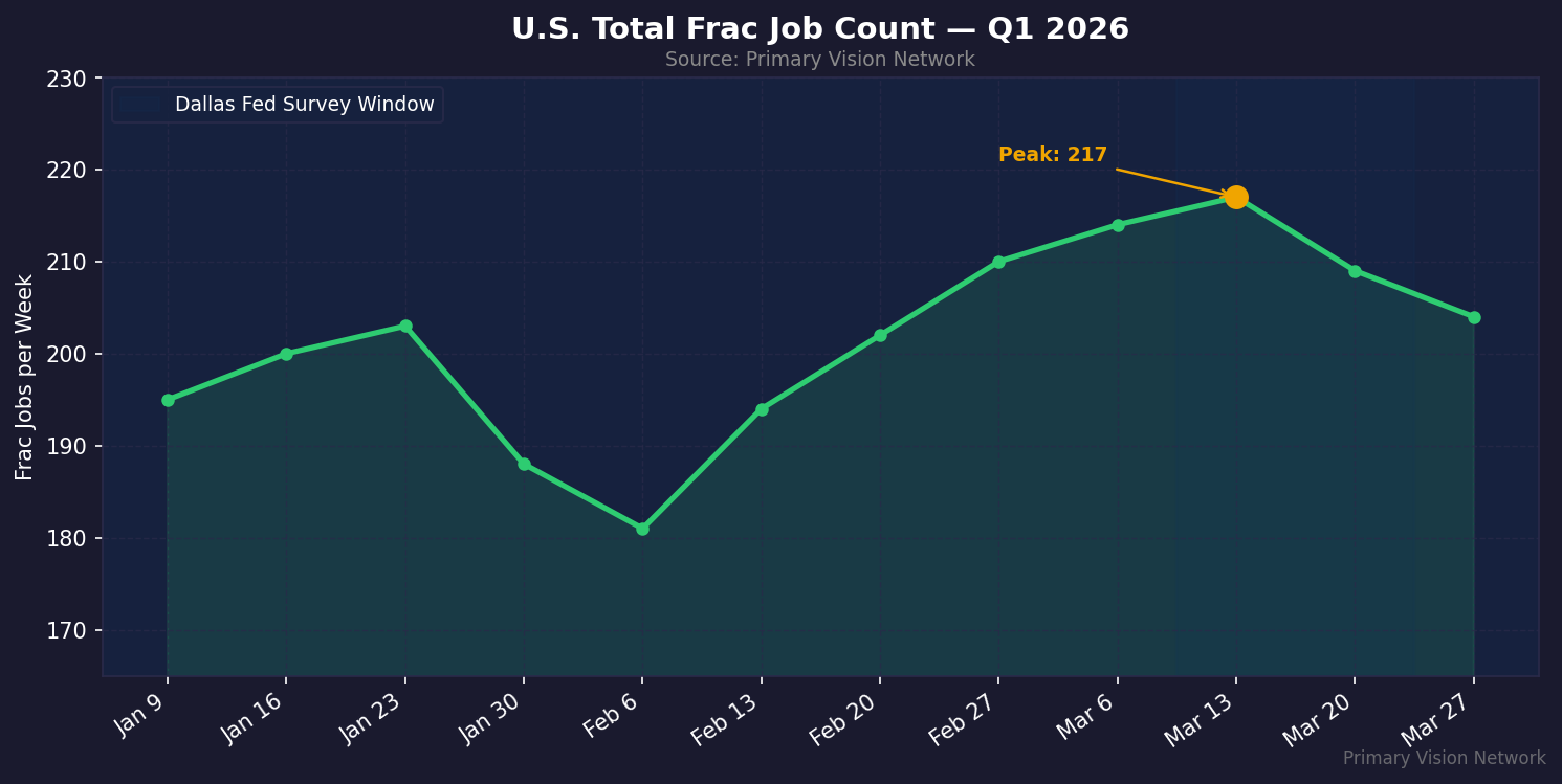 Primary Vision's data shows that the physical recovery was already well underway before the survey was even published. Total frac spread count climbed from around 145 in early February to 172 by the first week of March — a gain of nearly 20% in under six weeks. Frac job count followed the same trajectory, building steadily from 195 in early January to a Q1 peak of 217 by mid-March. The sector reactivated through the quarter, with completion calendars tightening and operators pulling forward DUC completions in response to a constructive price environment. ProFrac's management confirmed this directly, noting that utilization and operational efficiency both improved through Q4 with pricing holding stable. ProPetro similarly reported contracted fleets and disciplined deployment rather than idle capacity sitting on the sidelines.