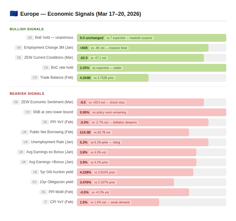Europe entered 2026 carrying genuine hope: Germany's €500 billion fiscal package, defence spending acceleration, and an ECB that had stopped tightening. Rabobank flagged that the fiscal investment agenda would push long-term eurozone yields higher as debt issuance rises — a cost Europe was willing to absorb in exchange for growth. The ZEW Economic Sentiment collapsing to -0.5 against a +39.0 consensus this week signals that institutional investors have stopped believing the recovery arrives on schedule.