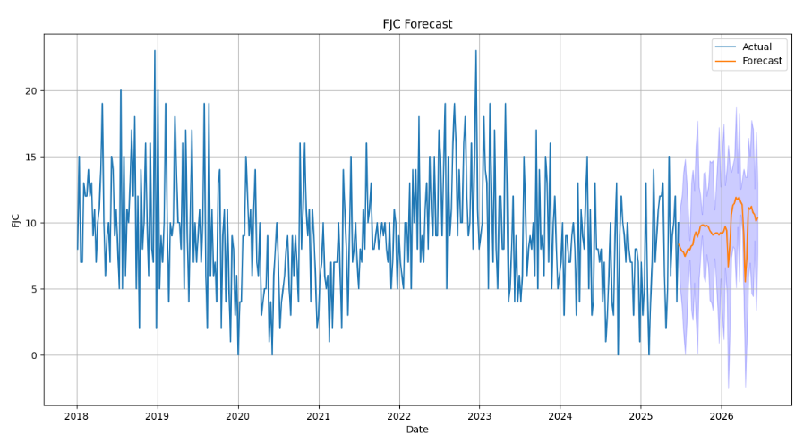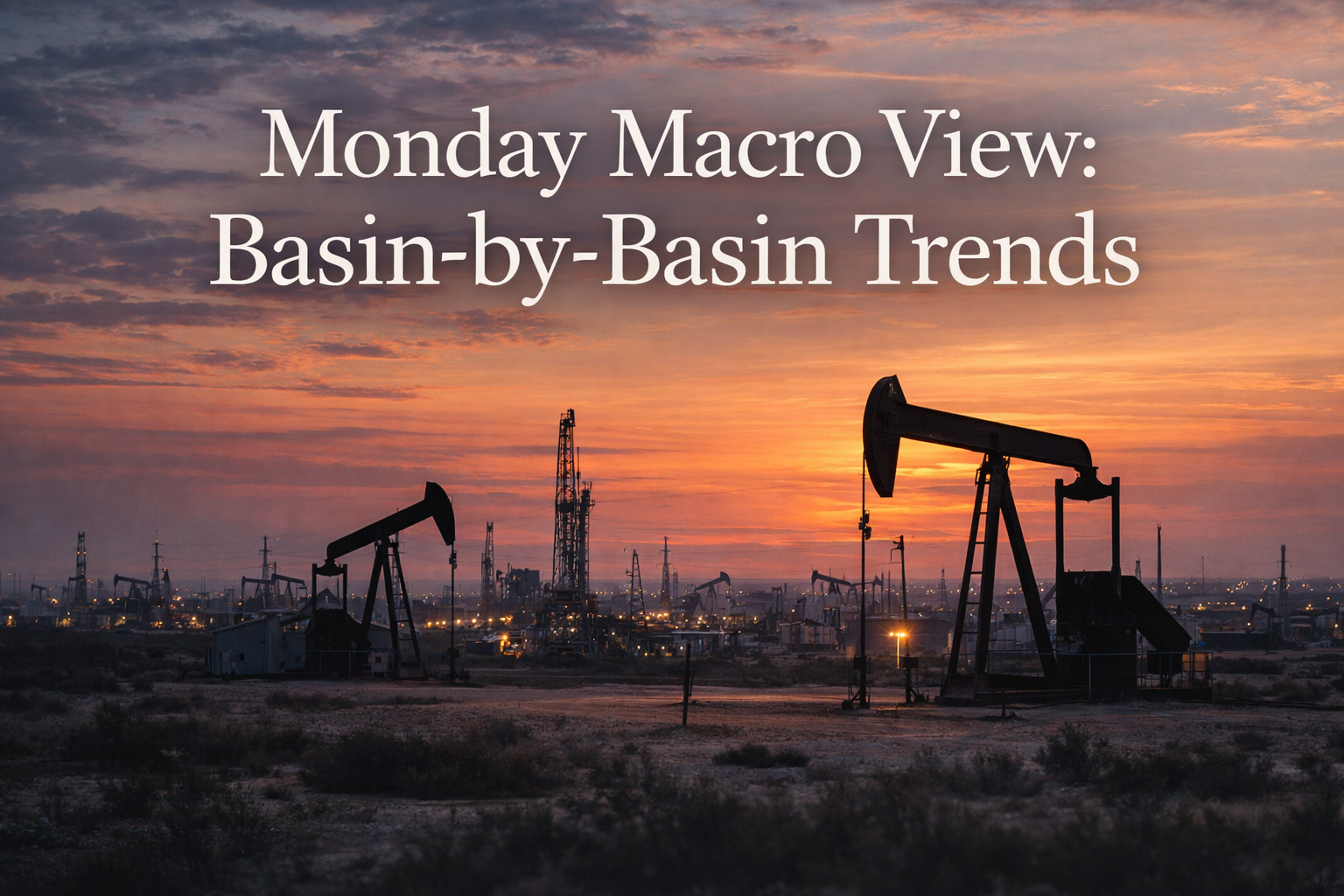 On the FJC side, the basin-level forecast data adds a dimension that the weekly actuals alone do not convey. The Permian, which printed 103 this week, is forecast to partially recover to 109 — but the yearly change of -33 is the more consequential number. This is not weekly noise; it points to a basin undergoing a structural reduction in completions intensity year-on-year, with downstream implications for associated gas volumes that remain to be fully priced into supply outlooks.
