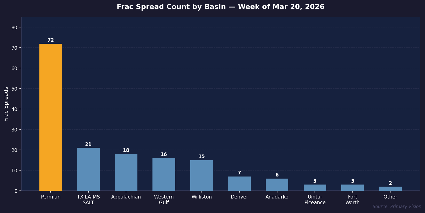 The Frac Spread Count (FSC) for the week ending March 20 came in at 164, reflecting a week-on-week decline of 8. The Frac Job Count (FJC) mirrored that movement, dropping by 8 as well to stand at 209. While the pullback may draw attention at first glance, it should be contextualized within the broader trend: activity had been registering consecutive upticks for more than three weeks prior to this reading, suggesting this week's softness is more of a routine consolidation than a directional reversal. Seasonal patterns and operational scheduling between operators can account for single-week fluctuations of this magnitude, and the overall activity level remains within the range observed over the past month.
