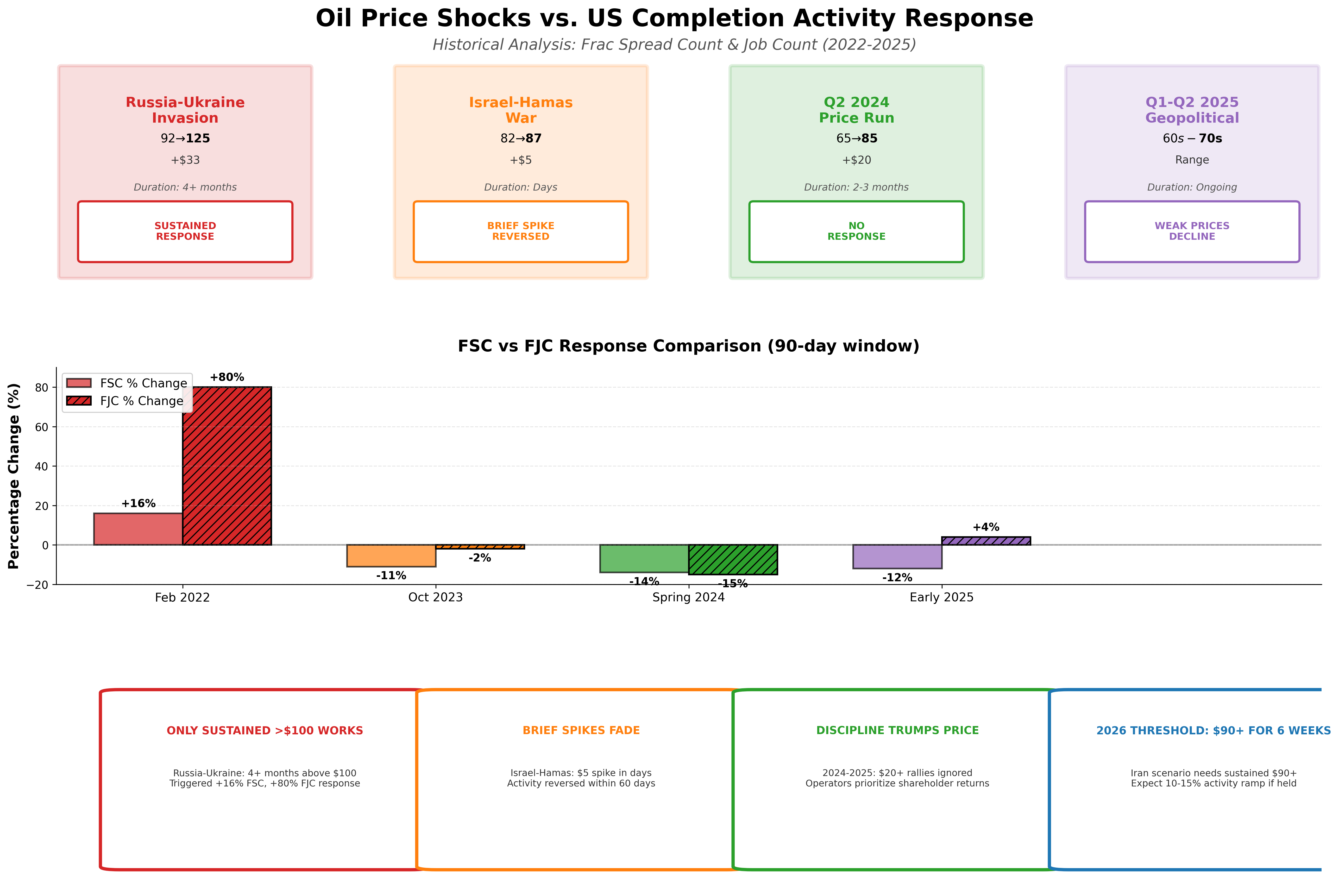 Historical data from Primary Vision shows the answer depends entirely on duration. When Russia invaded Ukraine in February 2022 and WTI surged from $92 to $125 per barrel, frac spreads climbed 16% over the following 90 days, rising from 244 in late December 2021 to 283 by early June 2022. That response reflected four consecutive months of oil trading above $100, giving operators confidence that marginal inventory would pencil. The Israel-Hamas conflict in October 2023 produced a different outcome. WTI spiked 6% from $82 to $87 but faded within days. Spreads ticked up 6% in the immediate 60-day window before collapsing 11% to 234 by January 2024 as prices rolled over. The 2024 spring rally from $65 to $85 generated zero activity response, with spreads declining 14% from 264 in mid-February to 228 by mid-July as operators maintained capital discipline. The pattern holds: sustained prices above $90 for six weeks trigger a 10-15% ramp in spread count within 90 days. Brief spikes fade without mobilizing capital.